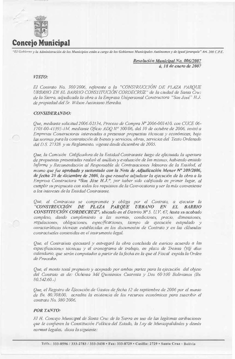 Se aprueba contrato 380/2006 Construcción de Plaza Parque Urbano en el Barrio Constitución CORDECRUZ, suscrito con la empresa SAN JOSE.
