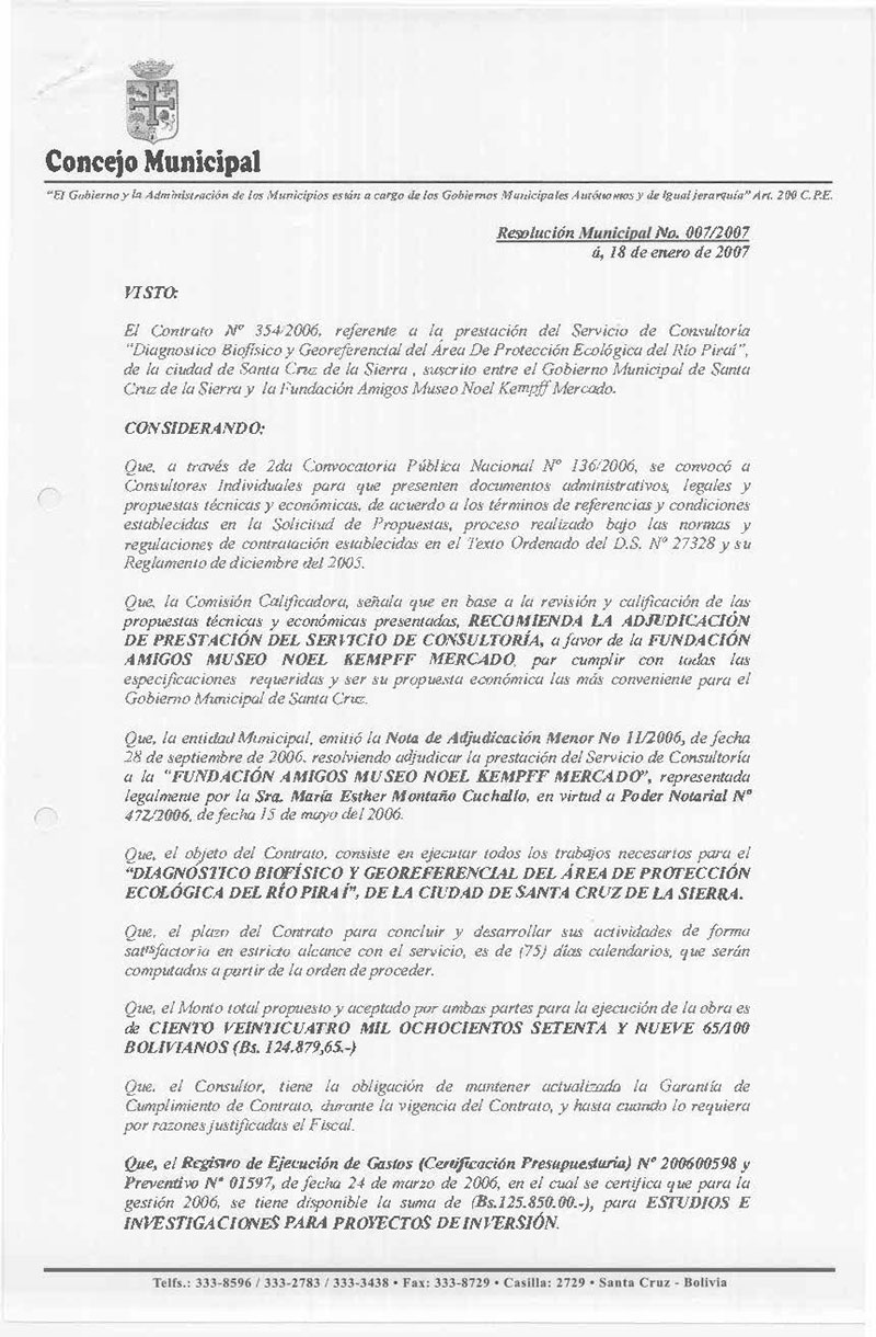 Se Aprueba contrato 354/2006 Prestacion de Servicio de Consultoria "Diagnostico Biofísico y Georeferencial del Área de Protección Ecológica del Río Piraí por la Fundación Amigos Museo Noel Kempff Mercado.