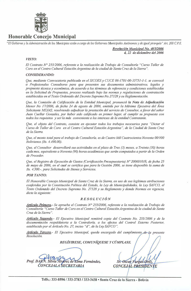 Se aprueba el Contrato No. 255/2006, referente a la realización de Trabajo de Consultoría “Curso Taller de Coro en el Centro Cultural Estación Argentina de la ciudad de Santa Cruz de la Sierra".