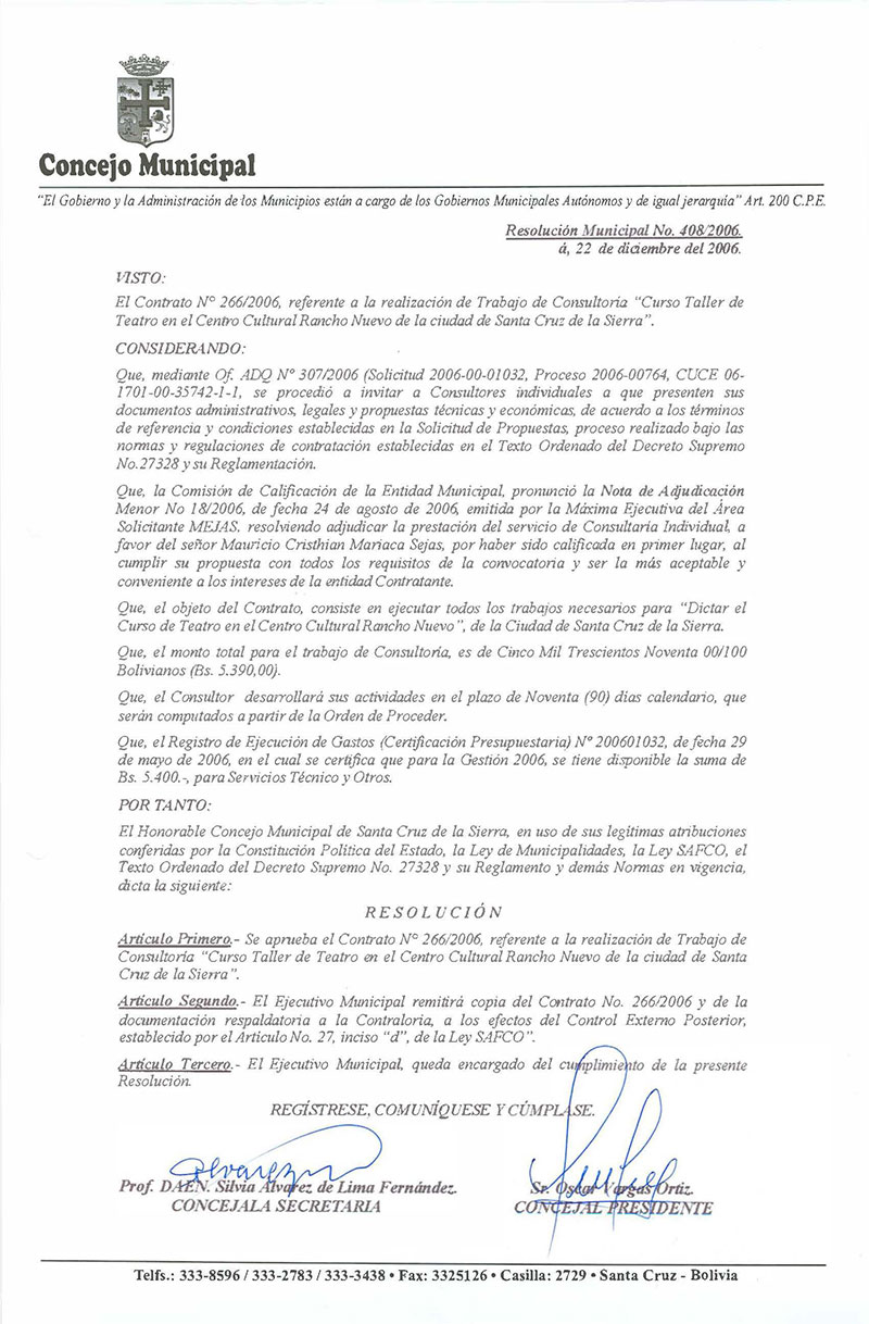 Aprueba el Contrato N° 266/2006, referente a la realización de Trabajo de Consultoría “Curso Taller de Teatro en el Centro Cultural Rancho Nuevo de la ciudad de Santa Cruz de la Sierra”, suscrito con el Consultor Mauricio Cristhian Mariaca Sejas.