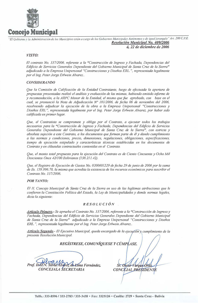 Aprueba el Contrato N° 337/2006, referente a la Construcción de Ingreso y Fachada, Dependencias del Edificio de Servicios Generales Dependientes del Gobierno Municipal de Santa Cruz de la Sierra, adjudicado a la Empresa Unipersonal Construcciones y Diseños ERL.