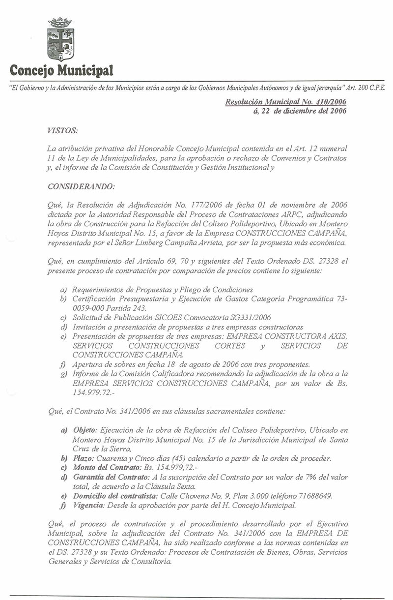 Aprueba el Contrato N° 341/2006, para la Ejecución de la Obra de Refacción del Coliseo Polideportivo, ubicado en Montero Hoyos, Distrito Municipal N° 15, por un valor de Bs.- 154.979.72 (Ciento Cincuenta y Cuatro Mil Novecientos Setenta y Nueve 72/100), suscrita con la “Empresa Construcciones Campaña”.