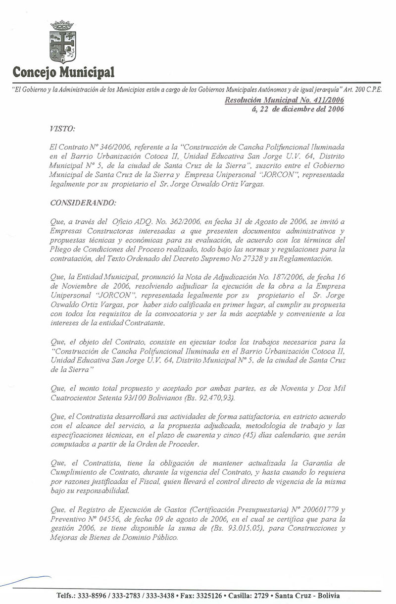 Aprueba el Contrato N° 346/2006, referente a la “Construcción de Cancha Polifuncional Iluminada en el Barrio Urbanización Cotoca II, Unidad Educativa San Jorge UV-64, Distrito Municipal N°5 de la ciudad de Santa Cruz de la Sierra”, suscrito con la Empresa Unipersonal JORCON.