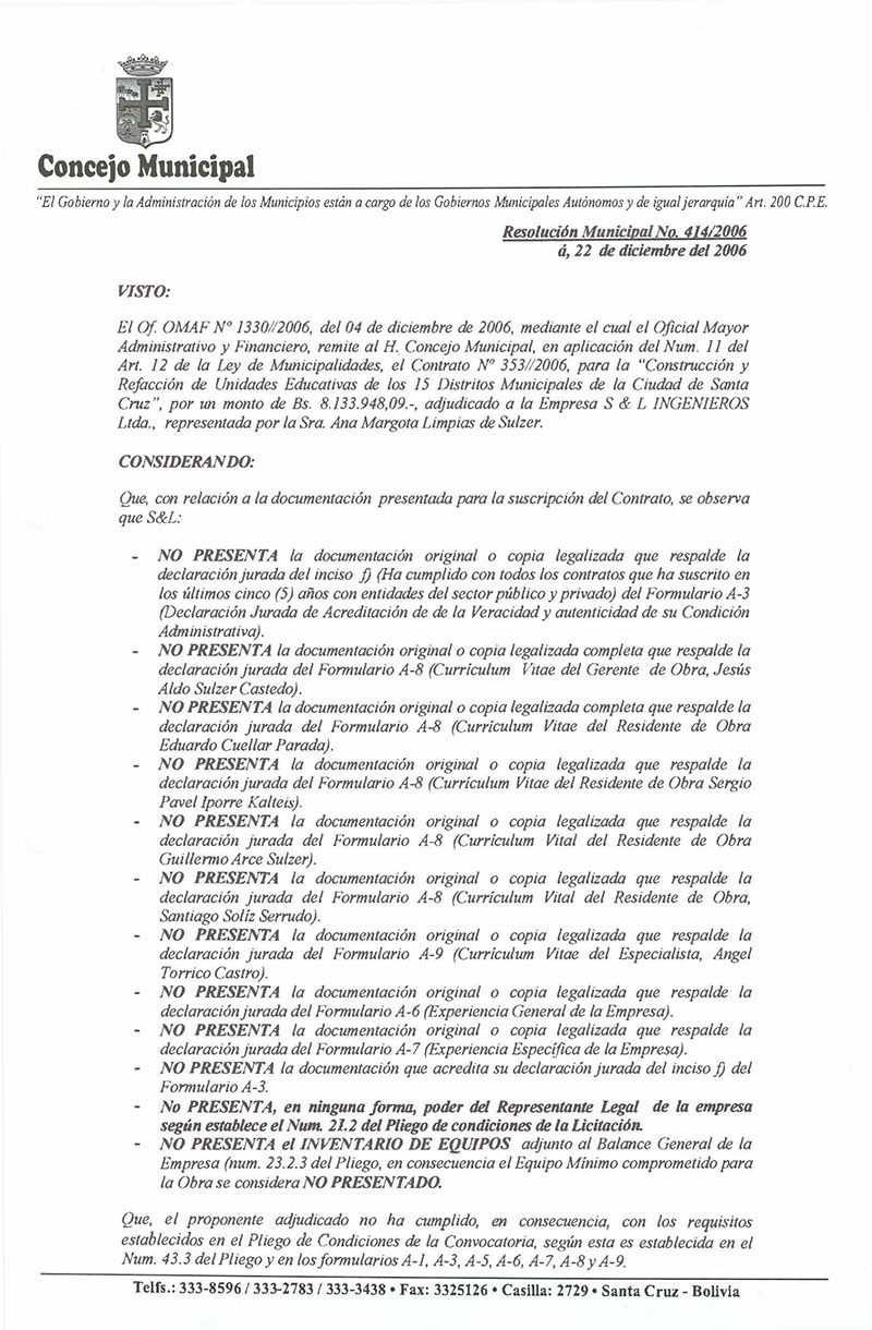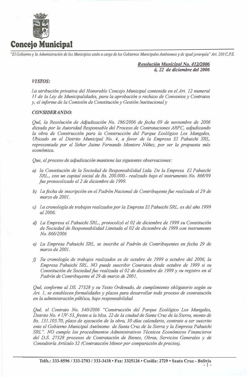 Rechaza el Contrato N° 340/2006 con la Empresa de Servicios y Construcciones El Pahuichi SRL, para la Ejecución de la Obra de Construcción del Parque Ecológico Los Mangales, ubicado en el Distrito Municipal 4 UV-53.