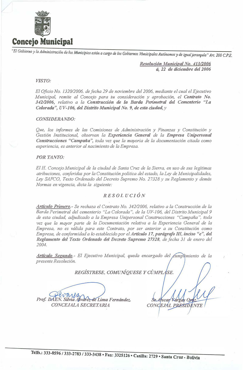 Rechaza el Contrato N° 342/2006, relativo a la Construcción de la Barda Perimetral del Cementerio “La Colorada” de la UV-106, del Distrito Municipal N° 9 de esta ciudad, adjudicado a la Empresa Unipersonal Construcciones Campaña, por documentación relativa a la Experiencia General de la Empresa, no es válida para este Contrato, por ser anterior a su Constitución como Empresa.