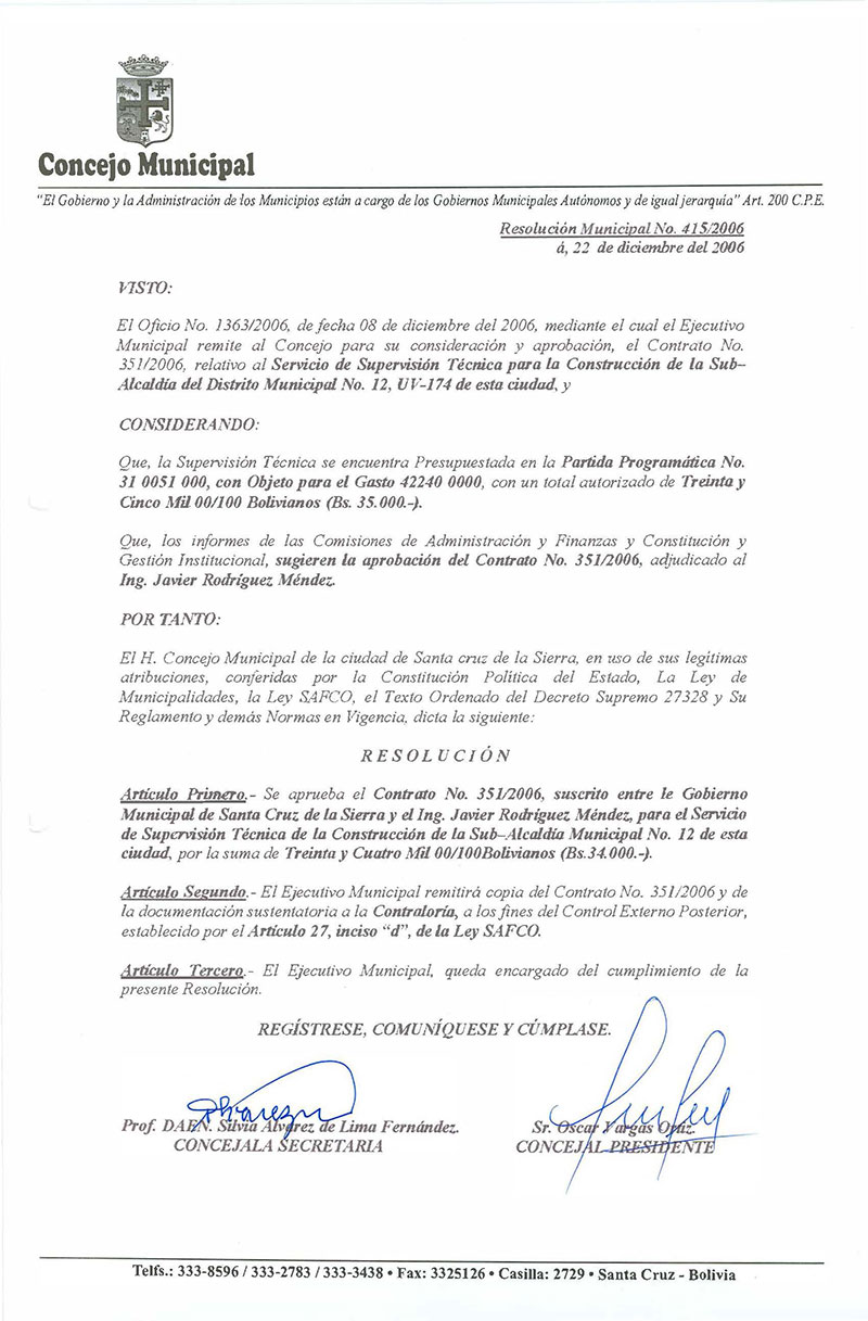 Aprueba el Contrato N° 351/2006, suscrito entre el Gobierno Municipal de Santa Cruz de la Sierra y el Ing. Javier Rodríguez Méndez, para el Servicio de Supervisión Técnica de la Construcción de la Sub-Alcaldía Municipal N° 12 de esta ciudad, por la suma de Bs.- 34.000 (Treinta y Cuatro Mil 00/100 Bolivianos).