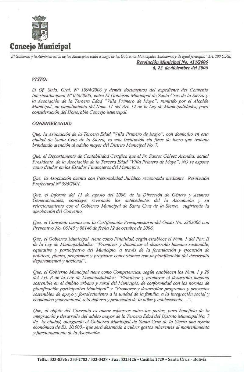 Aprueba el Convenio Interinstitucional N° 026/2006, entre el Gobierno Municipal de Santa Cruz de la Sierra y la Asociación de la Tercera Edad “Villa Primero de Mayo”.