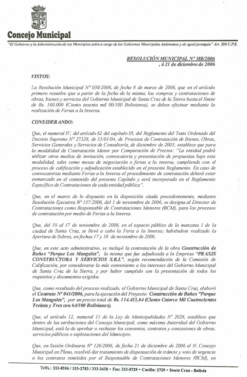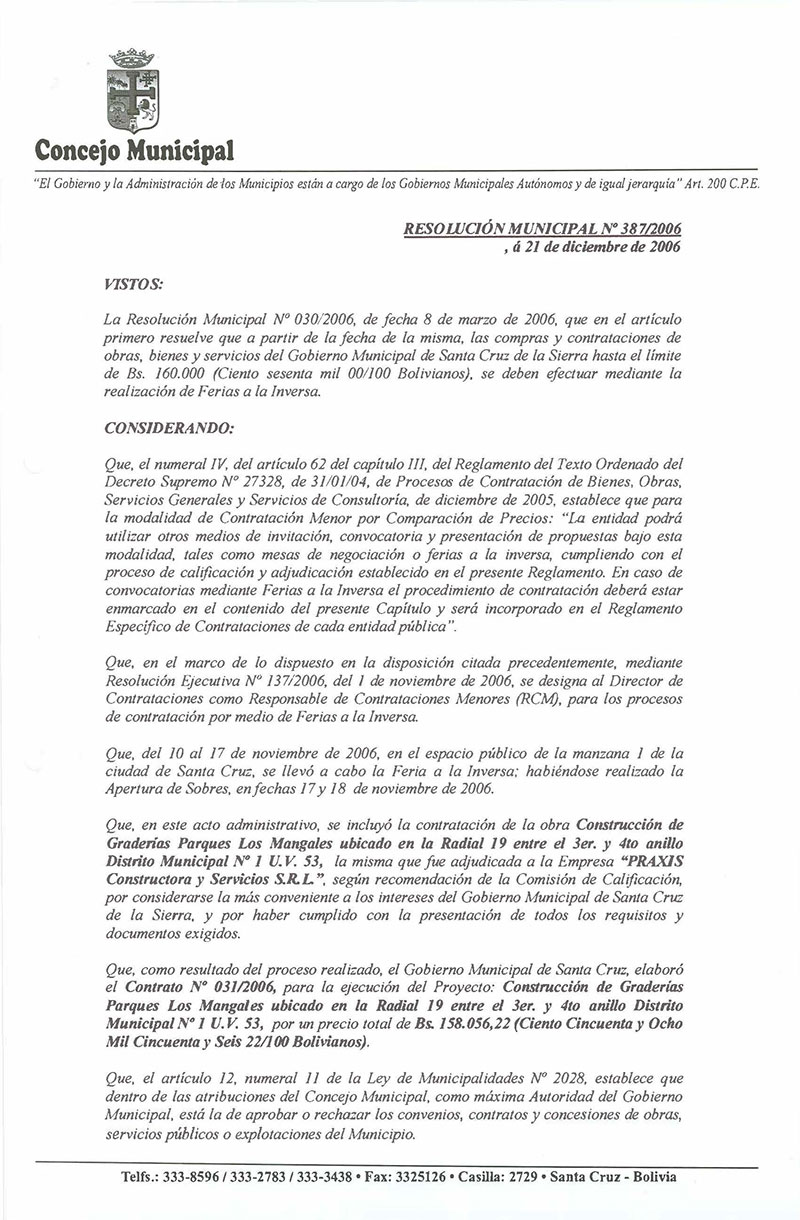 Aprueba el Contrato N° 031/2006, para la ejecución del Proyecto de Construcción de Graderías Parque Los Mangales, ubicado en la Radial 19 entre el 3er. y 4to. Anillo, Distrito Municipal N°. 1, UV-53, suscrito con la Empresa "PRAXIS Constructora y Servicios S.R.L".