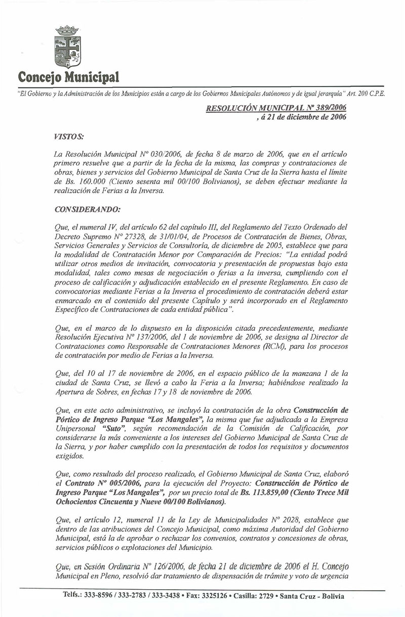 Aprueba el Contrato N° 005/2006, para la ejecución del Proyecto de Construcción de Pórtico de Ingreso Parque “Los Mangales”, suscrito con la Empresa Unipersonal “Suto”.