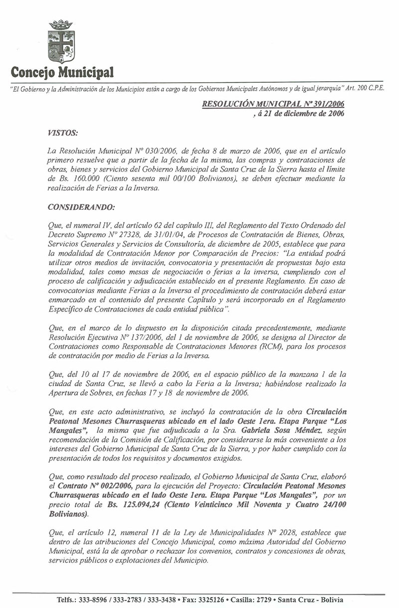 Aprueba el Contrato N° 002/2006, para la ejecución del Proyecto de Circulación Peatonal Mesones Churrasqueras, ubicado en el lado Oeste 1era. Etapa Parque “Los Mangales”, suscrito con la Sra. Gabriela Sosa Méndez.