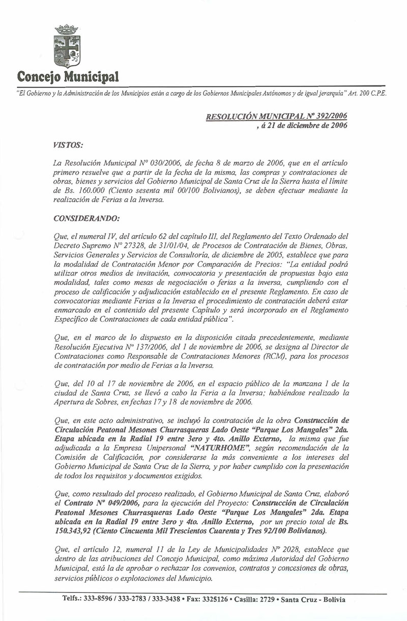 Aprueba el Contrato N° 049/2006, para la ejecución del Proyecto de Construcción de Circulación Peatonal Mesones Churrasqueras Lado Oeste “Parque Los Mangales” 2da. Etapa, ubicada en la Radial 19 entre 3ero. Y 4to. Anillo Externo, suscrito con la Empresa Unipersonal "NATURHOME".