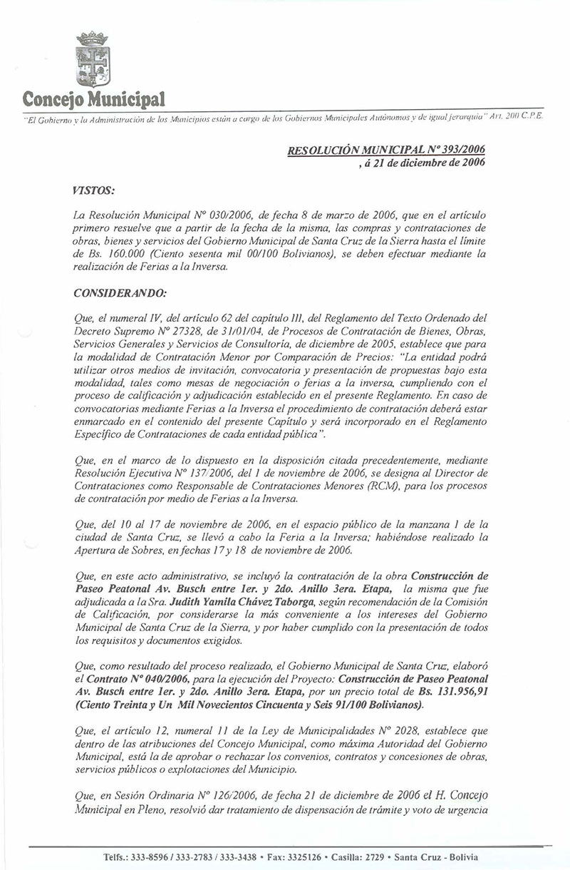 Aprueba el Contrato N° 040/2006, para la ejecución del Proyecto de Construcción de Paseo Peatonal Avda. Busch entre 1er. y 2do., 3era. Etapa, suscrito con la Sra. Judith Camila Chávez Taborga.