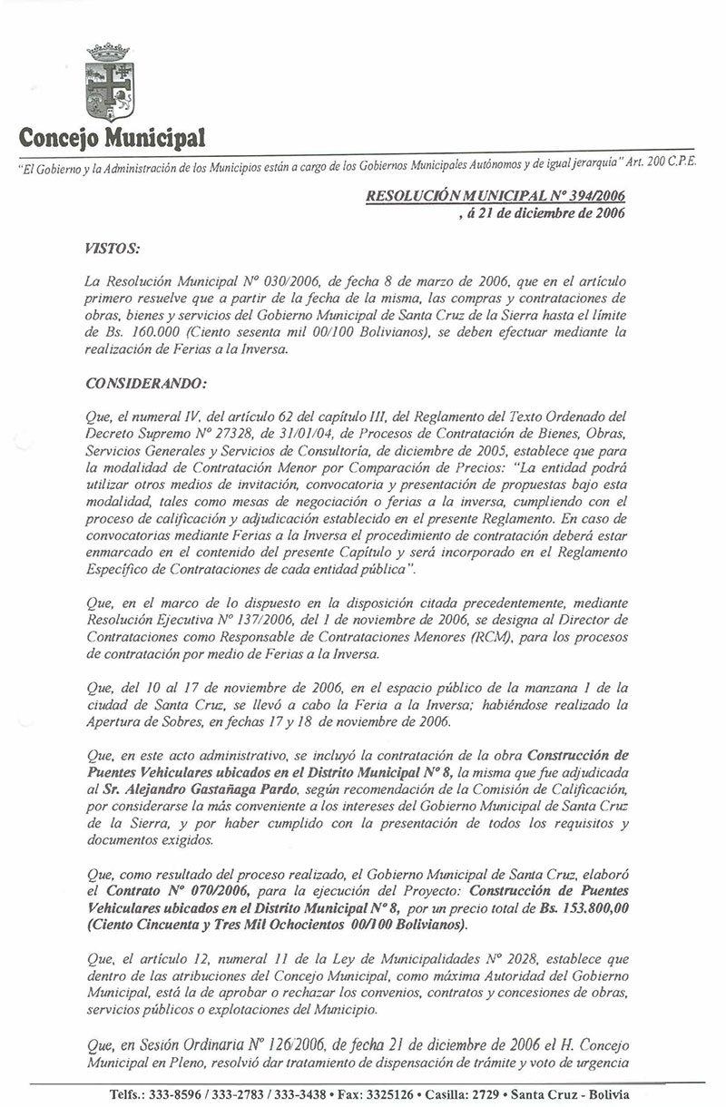 Aprueba el Contrato N° 070/2006, para la ejecución del Proyecto de Construcción de Puentes Vehículares, ubicados en el Distrito Municipal N° 8, suscrito con el Sr. Alejandro Gastañaga Pardo.