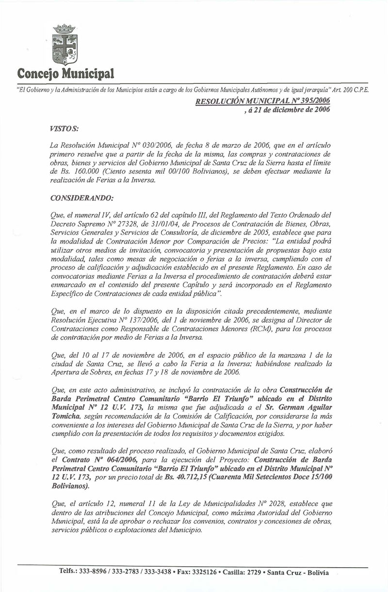 Aprueba el Contrato N° 064/2006, para la ejecución del Proyecto: Construcción de Barda Perimetral Centro Comunitario “Barrio El Triunfo”, ubicado en el Distrito Municipal N° 12, UV-173, suscrito con el Sr. Germán Aguilar Tomicha.