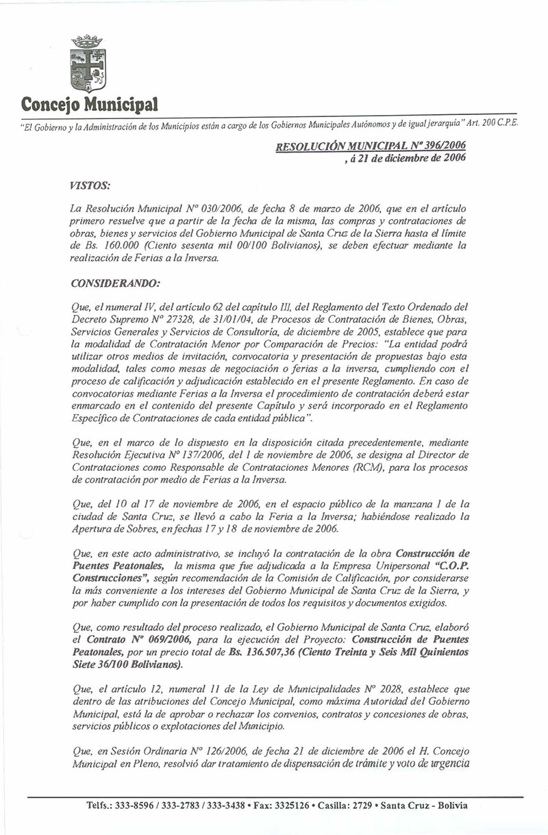 Aprueba el Contrato N° 069/2006, para la ejecución del Proyecto de Construcción de Puentes Peatonales, suscrito con la Empresa Unipersonal “C.O.P. Construcciones”.