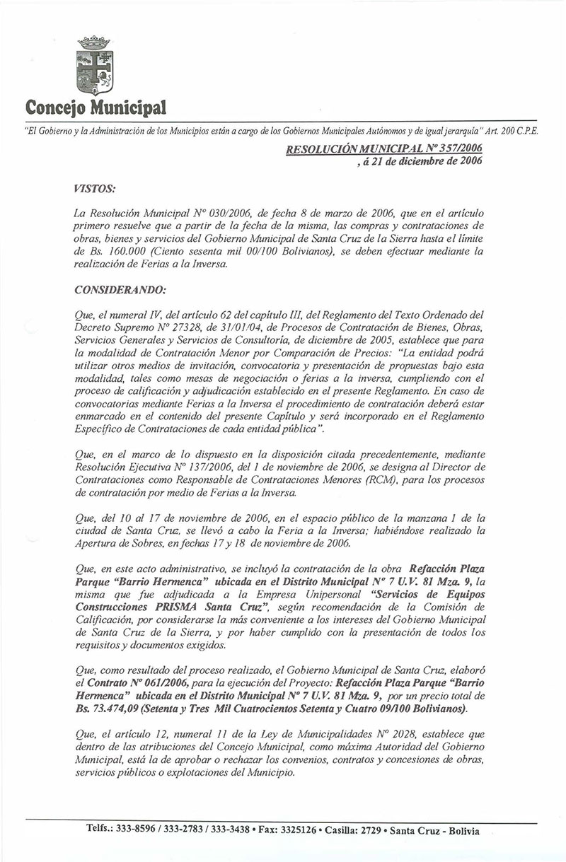 Se aprueba el Contrato No. 061/2006, para la ejecución del Proyecto: Refacción Plaza Parque “Barrio Hermenca”; ubicada en el Distrito Municipal No. 7, UV-81, Mza. 9, suscrito entre el Gobierno Municipal de Santa Cruz de la Sierra y la Empresa Unipersonal “Servicios de Equipos Construcciones PRISMA Santa Cruz”.