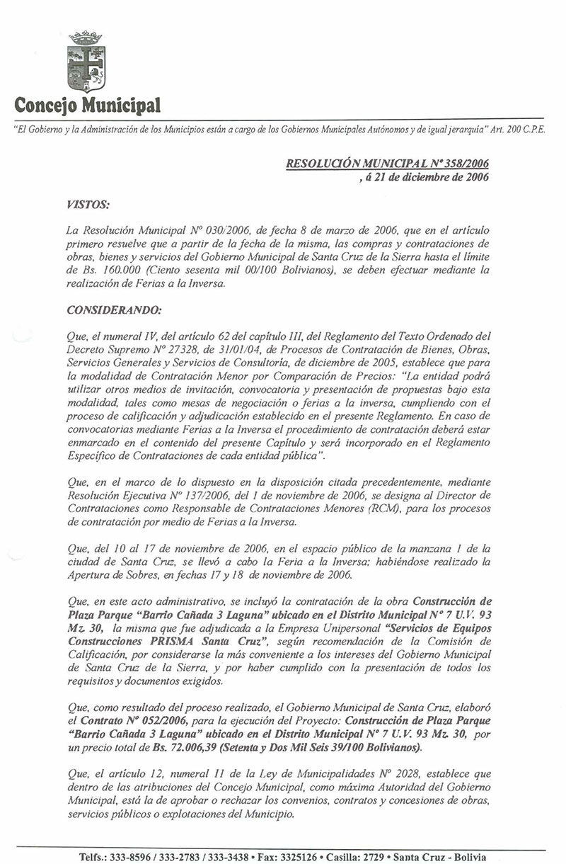 Se aprueba el Contrato No. 052/2006, para la ejecución del Proyecto: Construcción de Plaza Parque “Barrio Cañada 3 Laguna”, ubicado en el Distrito Municipal 7, UV-93, Mza. 30, suscrito entre el Gobierno Municipal de Santa Cruz de la Sierra y la Empresa Unipersonal Servicios de Equipos Construcciones PRISMA Santa Cruz.