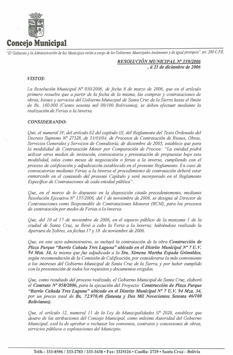 Se aprueba el Contrato No. 058/2006, para la ejecución del Proyecto: Construcción de Plaza Parque “Barrio Cañada Tres Laguna”, ubicado en el Distrito Municipal No. 7, UV-94, Mza. 34, suscrito entre el Gobierno Municipal de Santa Cruz de la Sierra y la Sra. Ximena Martha Espada Grimaldos.