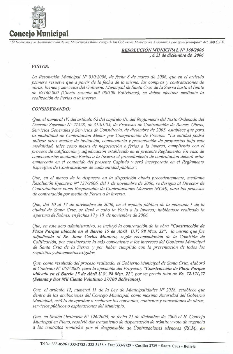 Se aprueba el Contrato No. 067/2006, para la ejecución del Proyecto: Construcción de Plaza Parque, ubicado en el Barrio 15 de Abril, UV-98, Mza. 22, suscrito entre el Gobierno Municipal de Santa Cruz de la Sierra y el Sr. Juan Carlos Montero Salvatierra.