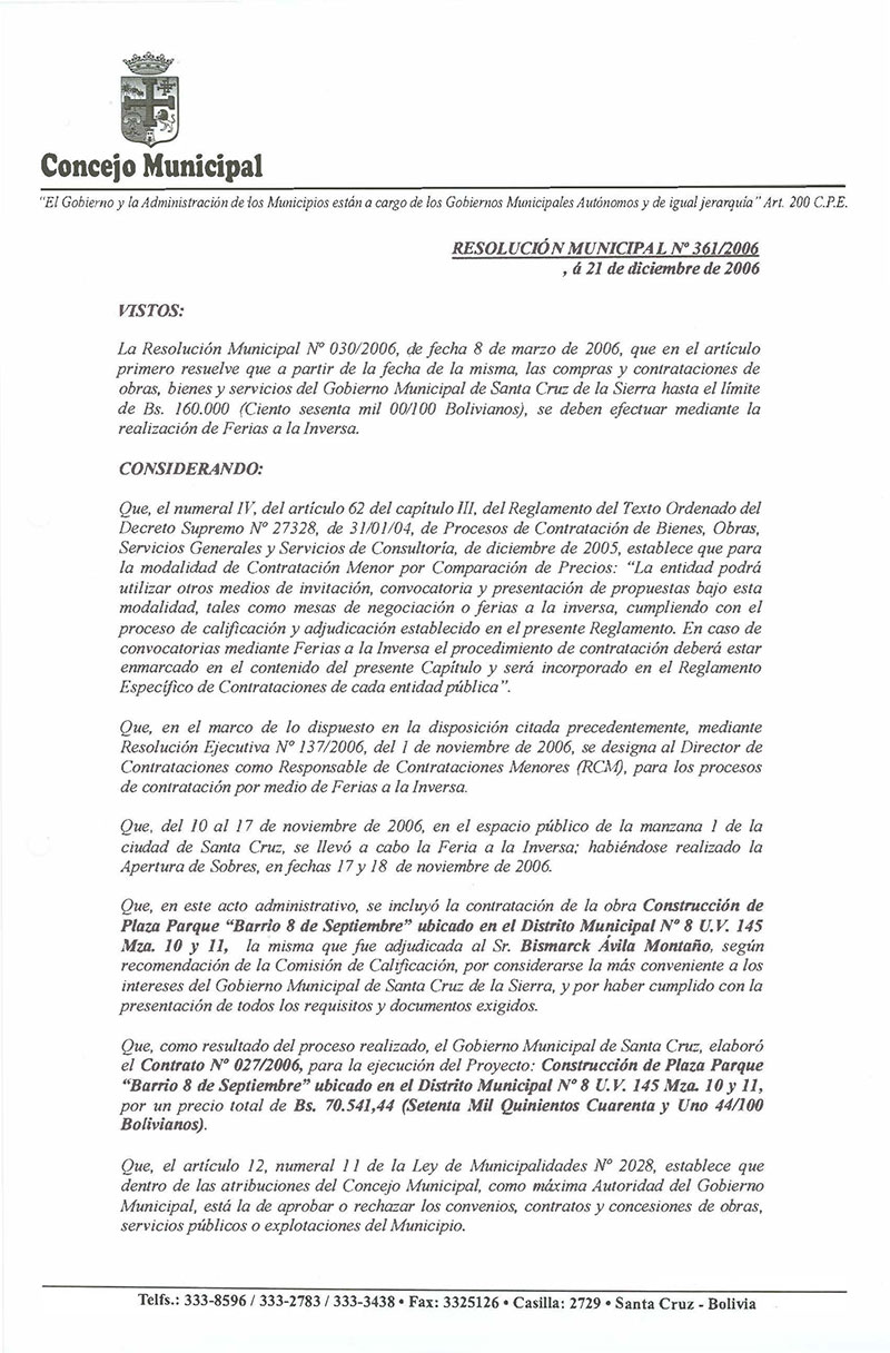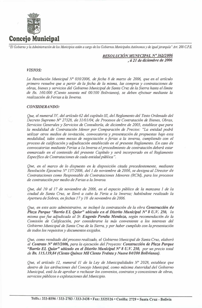 Se aprueba el Contrato No. 007/2006, para la ejecución del Proyecto: Construcción de Plaza Parque “Barrio El Quior”, ubicado en el Distrito Municipal No.8, UV-250, suscrito entre el Gobierno Municipal de Santa Cruz de la Sierra y la Sr. Eugenio Peralta Mendoza.