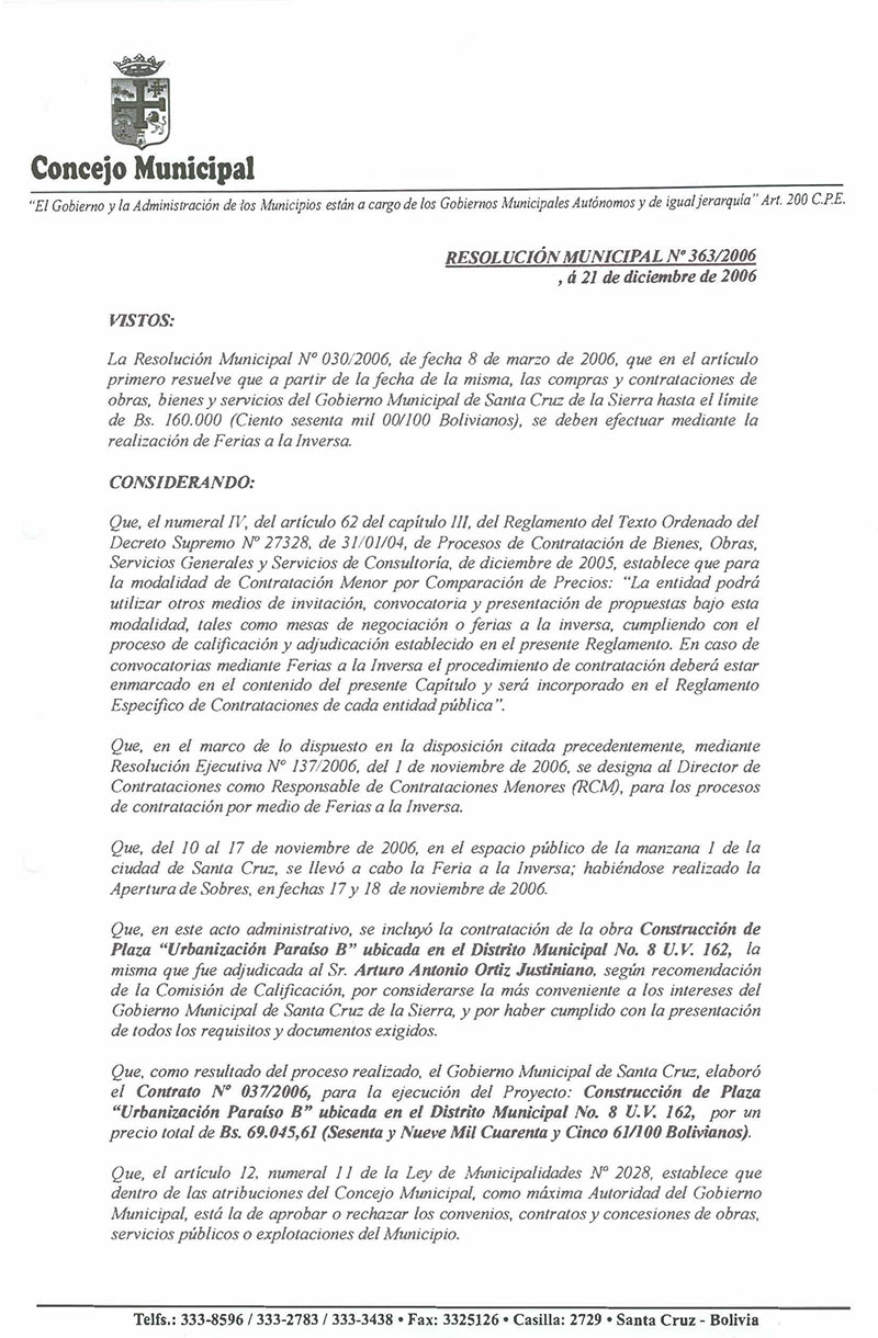 Se aprueba el Contrato No. 037/2006, para la ejecución del Proyecto: Construcción de Plaza “Urbanización Paraíso B”, ubicada en el Distrito Municipal No.8, UV-162, suscrito entre el Gobierno Municipal de Santa Cruz de la Sierra y el Sr. Arturo Antonio Ortiz Justiniano.