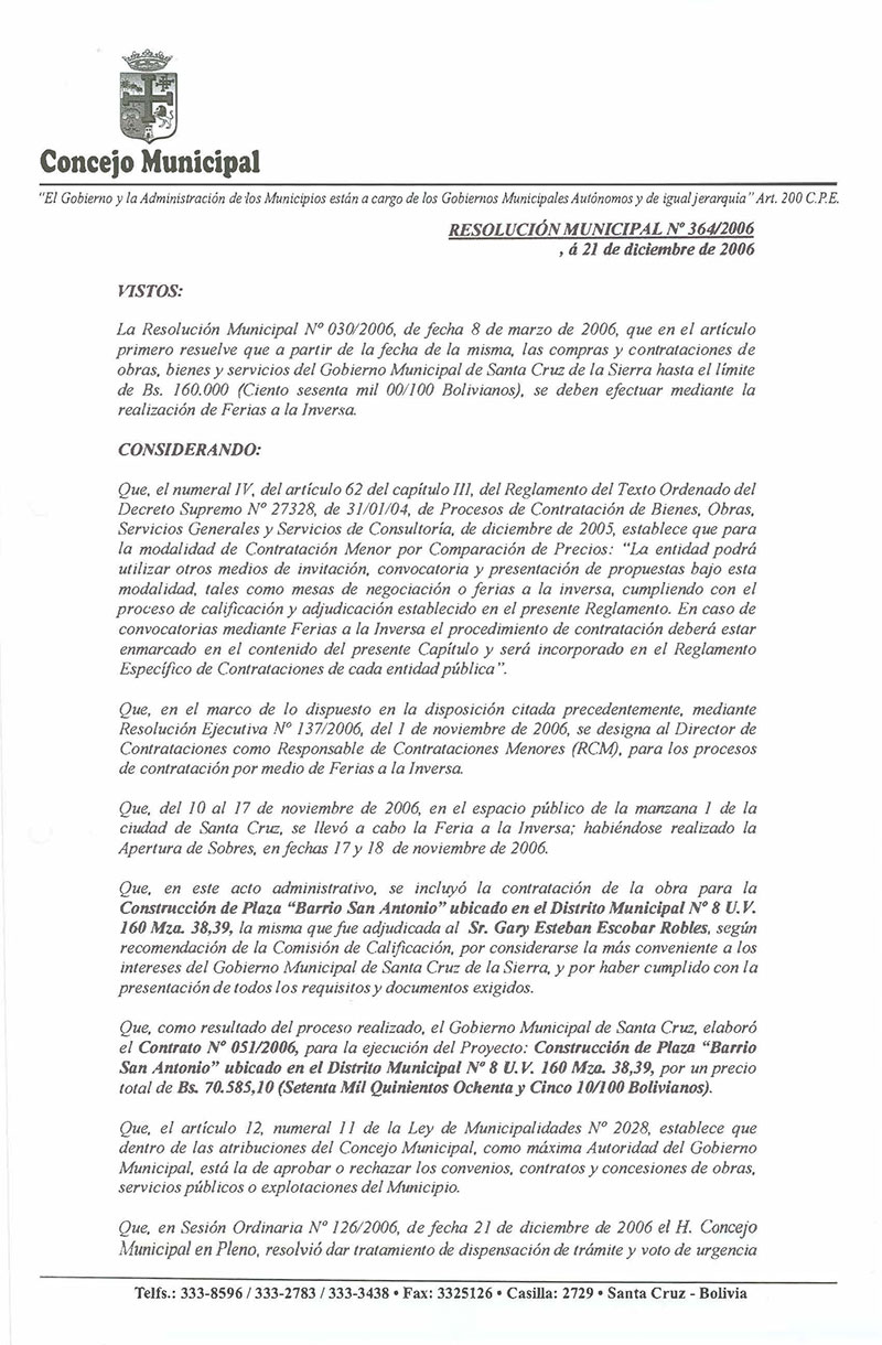 Se aprueba el Contrato No. 051/2006, para la ejecución del Proyecto: Construcción de Plaza “Barrio San Antonio”, ubicado en el Distrito Municipal No. 8, UV-160, Mzas. No. 38 y 39, suscrito entre el Gobierno Municipal de Santa Cruz de la Sierra y el Sr. Gary Esteban Escobar Robles.