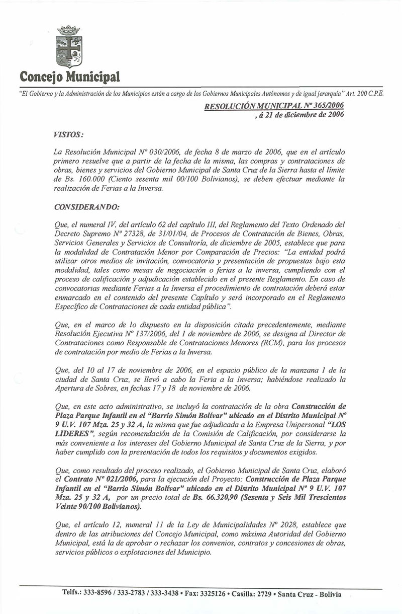 Se aprueba el Contrato No. 021/2006, para la ejecución del Proyecto: Construcción de Plaza Parque Infantil en el “Barrio Simón Bolívar”, ubicado en el Distrito Municipal No. 9, UV-107, Mzas. 25 y 32A, suscrito entre el Gobierno Municipal de Santa Cruz de la Sierra y la Empresa Unipersonal “Los Lideres”.