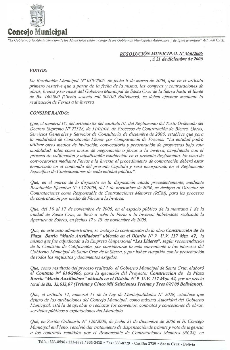 Se aprueba el Contrato No. 010/2006, para la ejecución del Proyecto: Construcción de la Plaza Barrio “Maria Auxiliadora”, ubicado en el Distrito No. 9, UV-117, Mza. 42, suscrito entre el Gobierno Municipal de Santa Cruz de la Sierra y la Empresa Unipersonal “Los Lideres”.