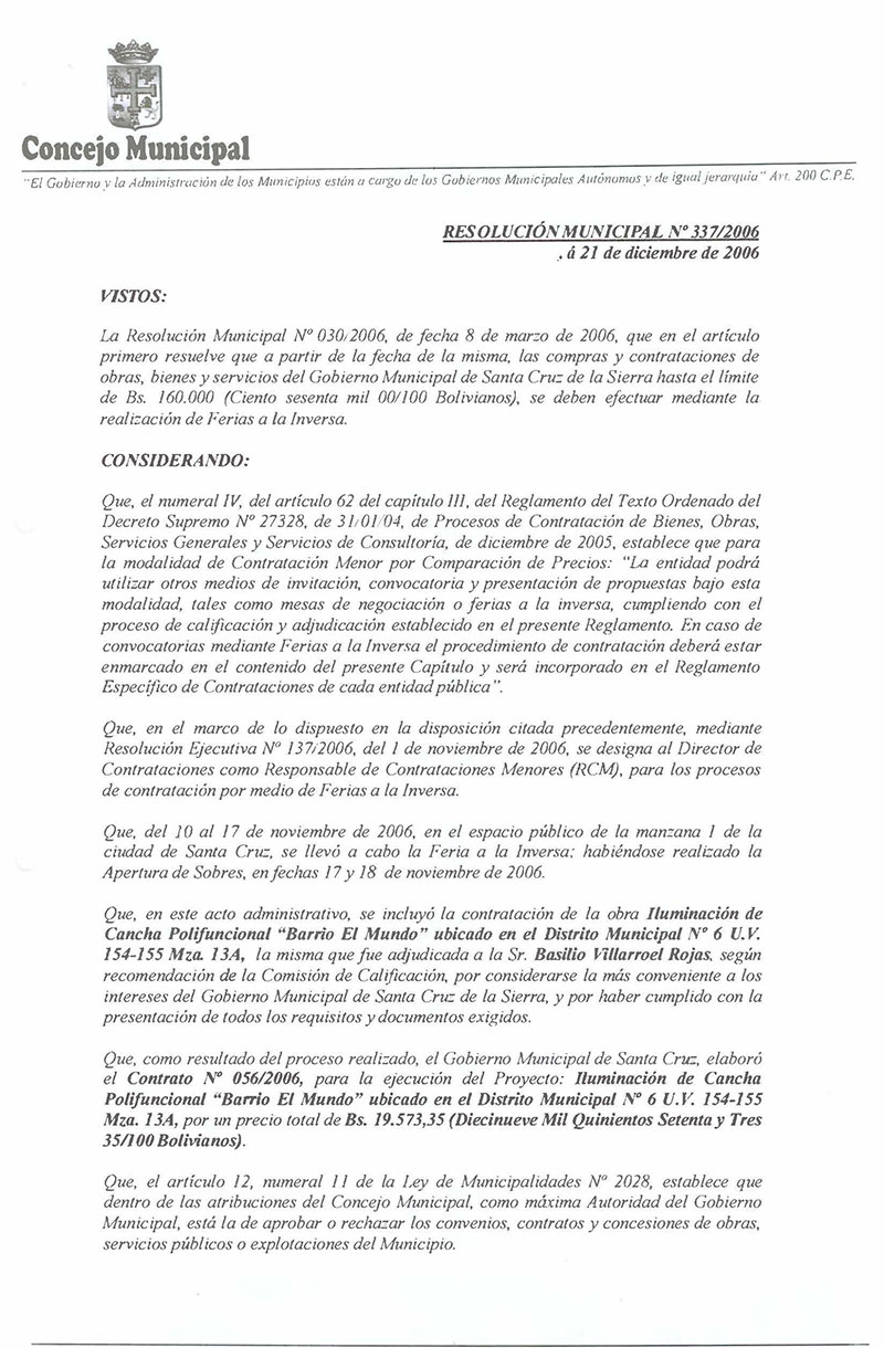 Se aprueba el Contrato No. 056/2006, para la ejecución del Proyecto: Iluminación de Cancha Polifuncional, “Barrio El Mundo”, ubicado en el Distrito Municipal No. 6, UV-154- 155, Mza. No. 13A, suscrito entre el Gobierno Municipal de Santa Cruz de la Sierra y el Sr. Basilio Villarroel Rojas.