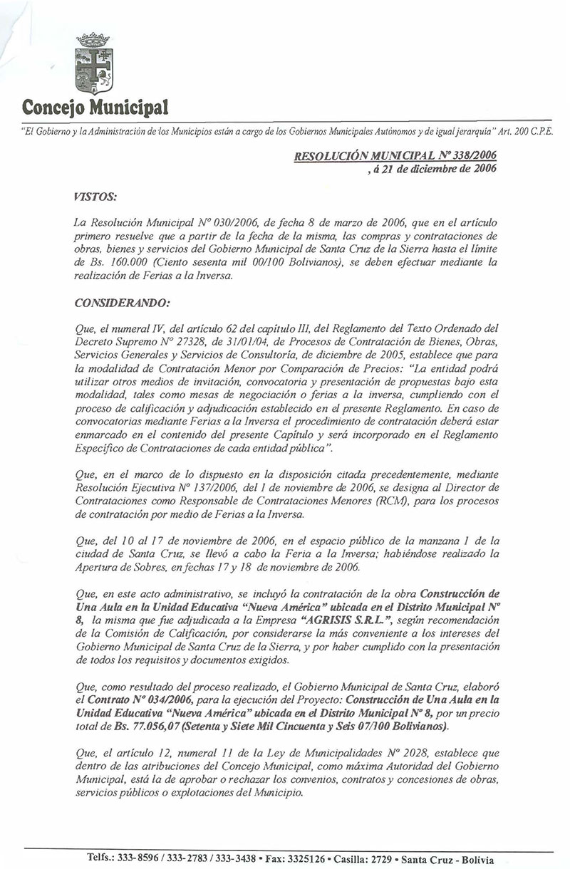 Se aprueba el Contrato No. 034/2006, para la ejecución del Proyecto: Construcción de Una Aula entre la Unidad Educativa “Nueva América”, ubicada en el Distrito Municipal No.8, suscrito entre el Gobierno Municipal de Santa Cruz de la Sierra y la Empresa “AGRISIS S.R.L.”.