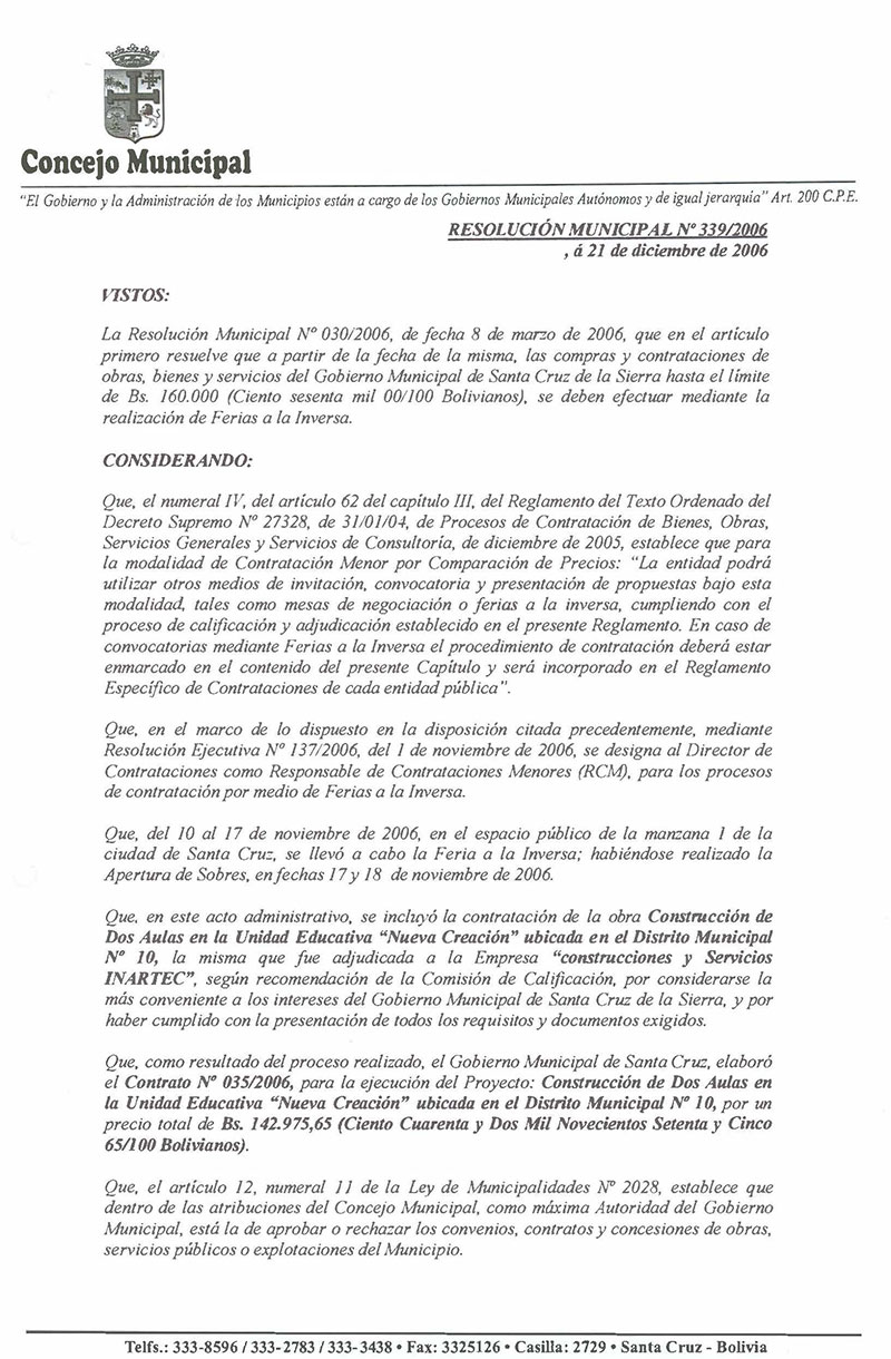 Se aprueba el Contrato No. 035/2006, para la ejecución del Proyecto: Construcción de Dos Aulas en la Unidad Educativa “Nueva Creación”, ubicada en el Distrito Municipal No. 10, suscrito entre el Gobierno Municipal de Santa Cruz de la Sierra y la Empresa “Construcciones y Servicios INARTEC”.