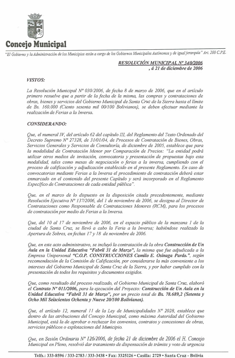 Se aprueba el Contrato No. 011/2006, para la ejecución del Proyecto: Construcción de Un Aula en la Unidad Educativa “Fabril 31 de Marzo”, suscrito entre el Gobierno Municipal de Santa Cruz de la Sierra y la Empresa Unipersonal “C.O.P. Construcciones Camilo E. Osinaga Pardo”.