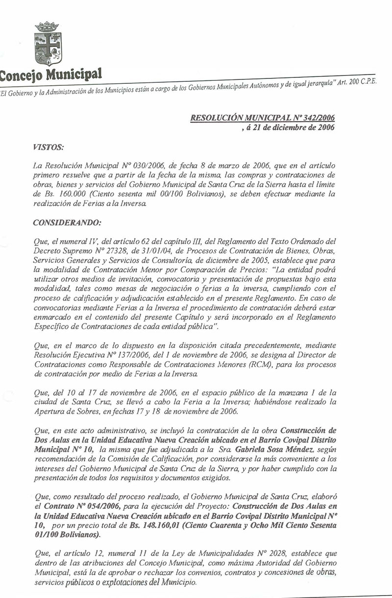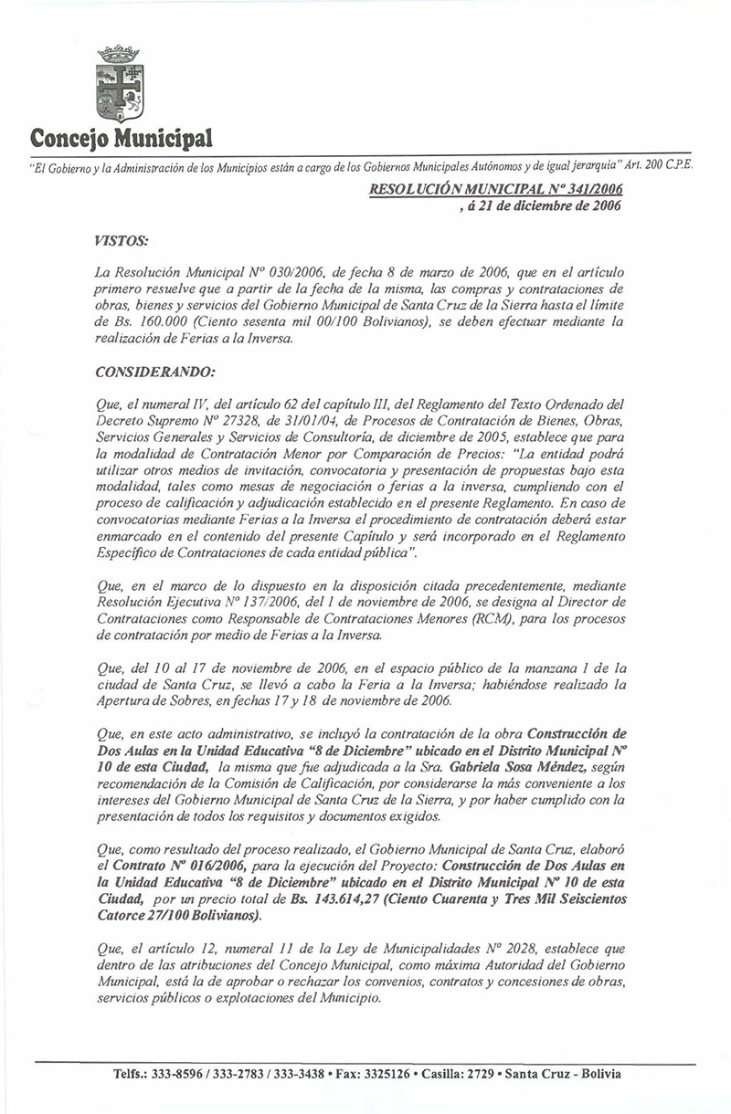 Se aprueba el Contrato No. 016/2006, para la ejecución del Proyecto: Construcción de dos Aulas en la Unidad Educativa “8 de Diciembre”, ubicado en el Distrito Municipal No.10 de esta ciudad, suscrito entre el Gobierno Municipal de Santa Cruz de la Sierra y la Sra. Gabriela Sosa Méndez.