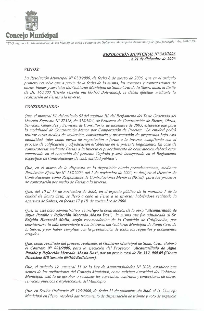Se aprueba el Contrato No. 001/2006, para la ejecución del Proyecto: Alcantarillado de Agua Potable y Refacción Mercado Abasto Dos, suscrito entre el Gobierno Municipal de Santa Cruz de la Sierra y el Sr. Brigido Huarachi Mollo.