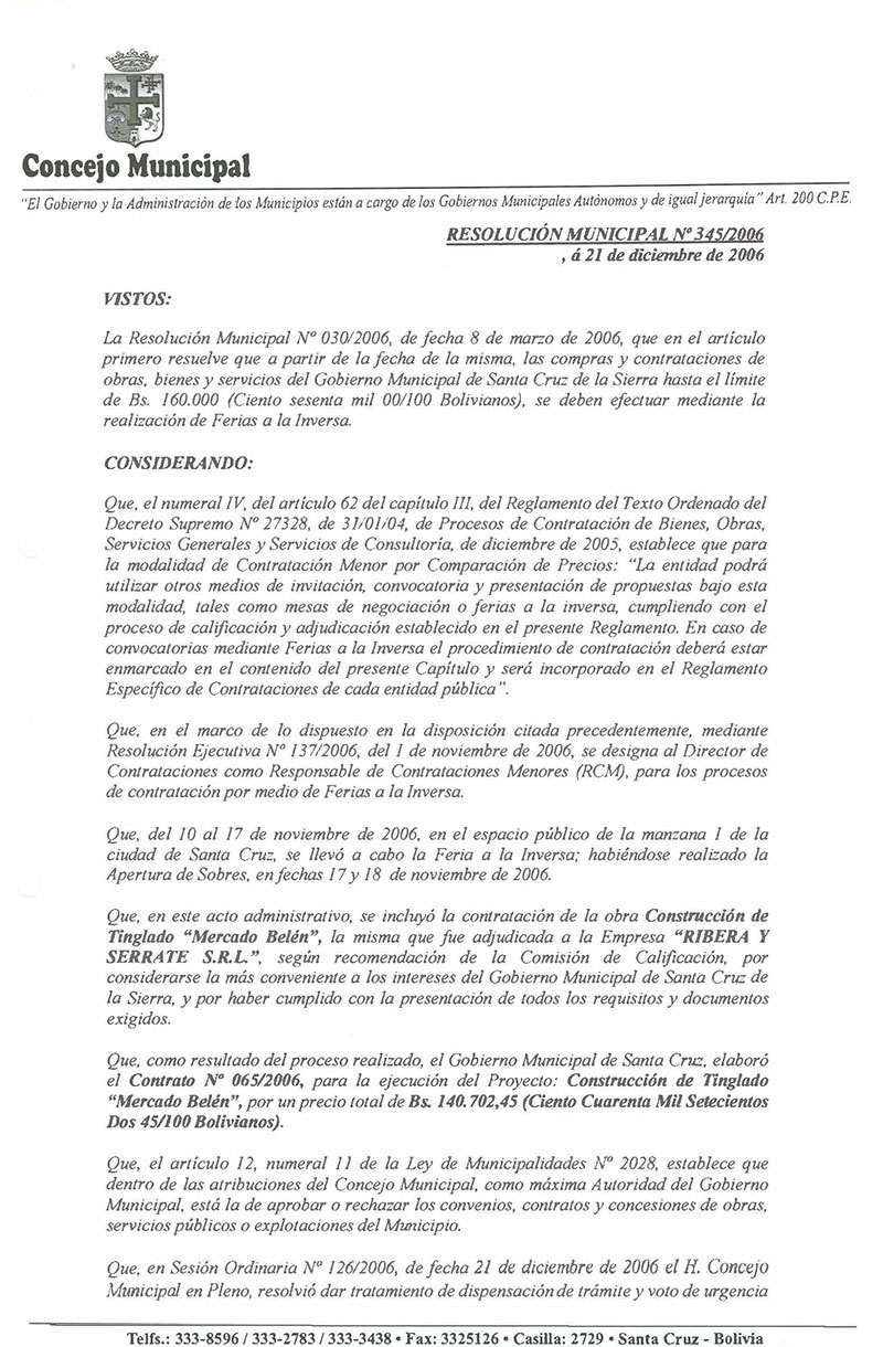 Se aprueba el Contrato No. 065/2006, para la ejecución del Proyecto: Construcción de Tinglado “Mercado Belén”, suscrito entre el Gobierno Municipal de Santa Cruz de la Sierra y la Empresa “Ribera y Serrate S.R.L.