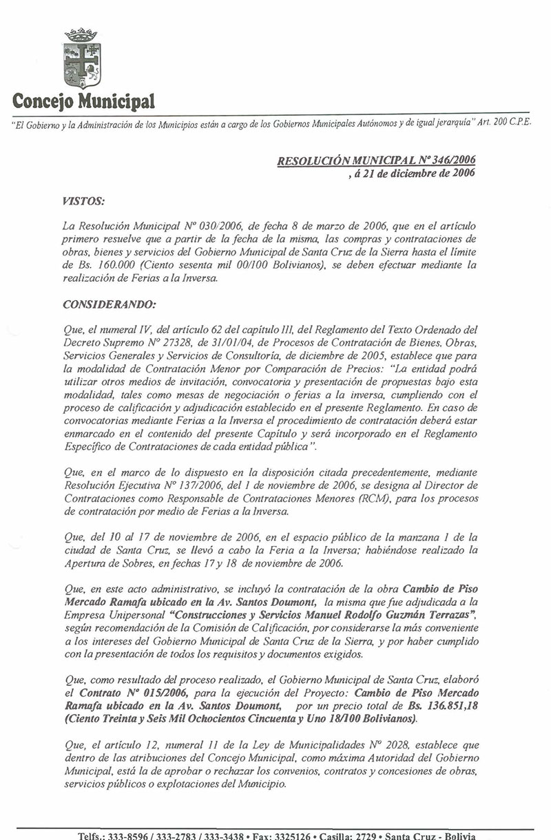Se aprueba el Contrato No. 015/2006, para la ejecución del Proyecto: Cambio de Piso Mercado Ramafa, ubicado en la Av. Santos Doumont, suscrito entre el Gobierno Municipal de Santa Cruz de la Sierra y la Empresa Unipersonal Construcciones y Servicios Manual Rodolfo Guzmán Terrazas.