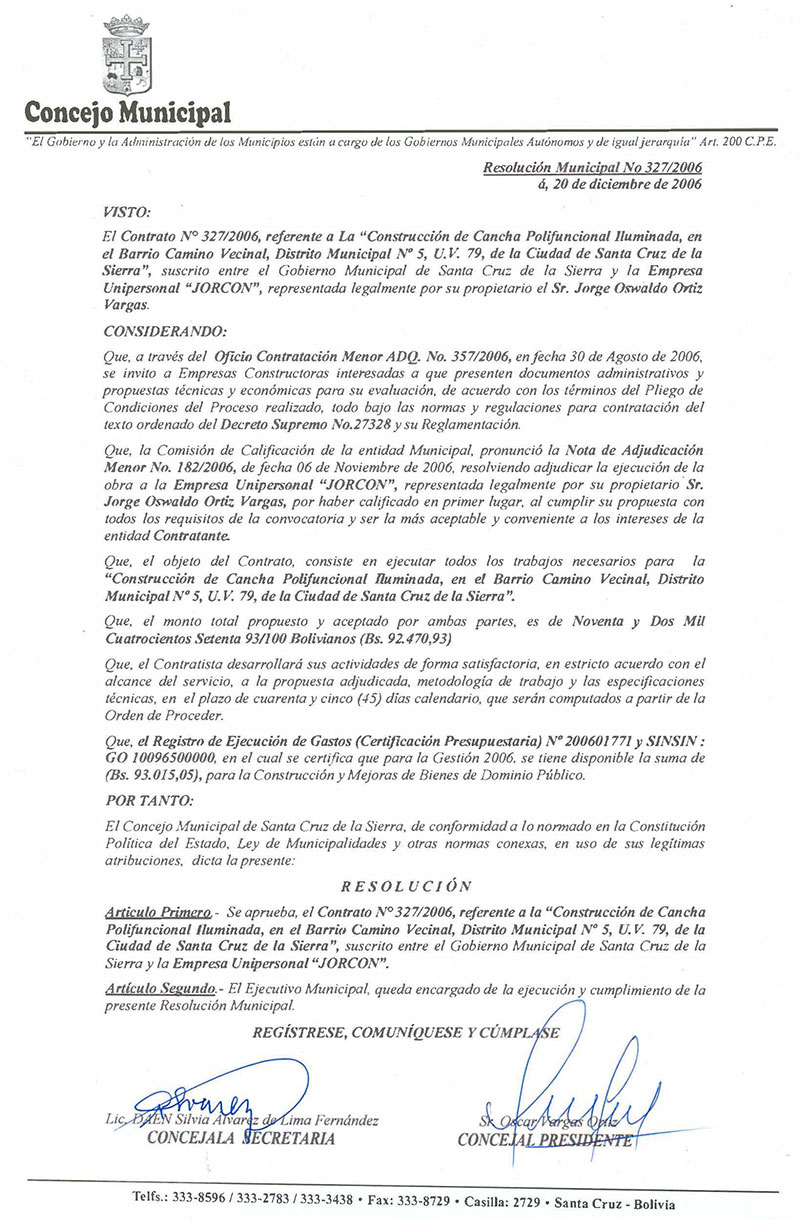 Se aprueba, el Contrato N° 327/2006, referente a la “Construcción de Cancha Polifuncional Iluminada, en el Barrio Camino Vecinal, Distrito Municipal Nº 5, U.V. 79, de la Ciudad de Santa Cruz de la Sierra”, suscrito entre el Gobierno Municipal de Santa Cruz de la Sierra y la Empresa Unipersonal “JORCON”.