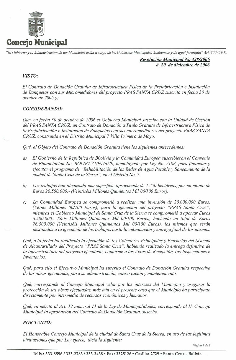 Se aprueba el Contrato de Donación Gratuita de la Infraestructura Física de la Prefabricación e Instalación de Banquetas con sus Micromedidores suscrito en fecha 30 de octubre de 2006, entre la Municipalidad de la Ciudad de Santa Cruz de la Sierra y la Unidad de Gestión del Proyecto PRAS SANTA CRUZ.