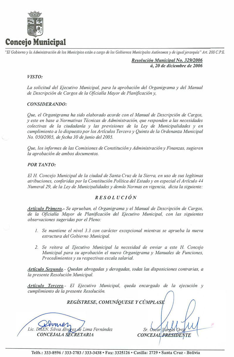Se aprueban el Organigrama y el Manual de Descripción de Cargos, de la Oficialía Mayor de Planificación del Ejecutivo Municipal.