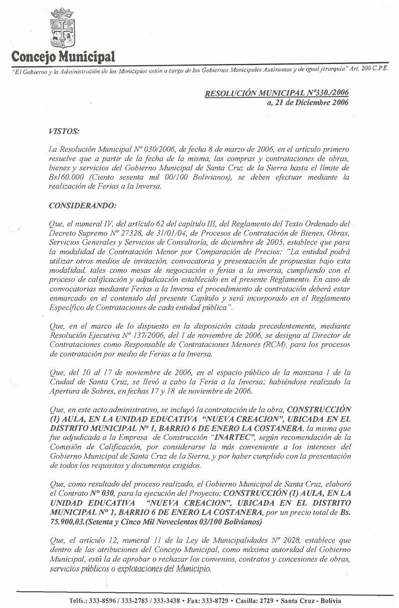 Se se aprueba el Contrato No. 030/2006, para la ejecución del Proyecto: Construcción de Un (1) Aula en la Unidad Educativa “Nueva Creación”, ubicada en el Distrito Municipal No. 1, Barrio 6 de Enero la Costanera, suscrito entre el Gobierno Municipal de Santa Cruz de la Sierra y la Empresa Constructora INARTEC”.