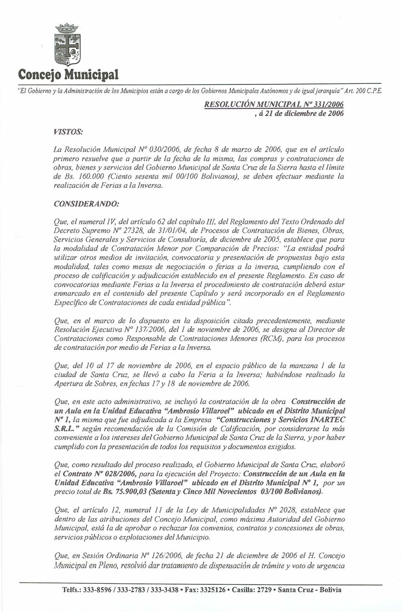 Se aprueba el Contrato No. 028/2006, para la ejecución del Proyecto: Construcción de un aula en la Unidad Educativa “Ambrosio Villarroel”, ubicado en el Distrito Municipal No.1, suscrito entre el Gobierno Municipal de Santa Cruz de la Sierra y la Empresa Construcciones y Servicios INARTEC S.R.L.