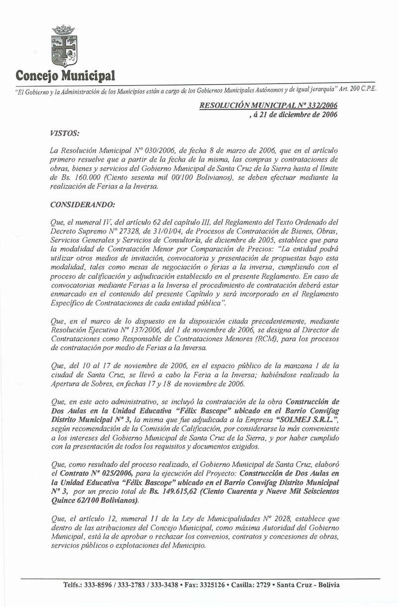 Se aprueba el Contrato No. 025/2006, para la ejecución del Proyecto: Construcción de Dos Aulas en la Unidad Educativa “Félix Bascope”, ubicado en el Barrio Convifag, Distrito Municipal No3., suscrito entre el Gobierno Municipal de Santa Cruz de la Sierra y la Empresa “SOLMEJ S.R.L.”.
