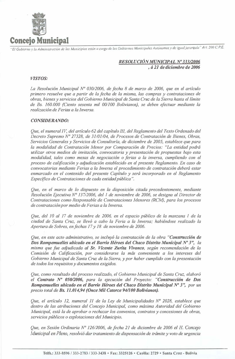 Se se aprueba el Contrato No. 050/2006, para la ejecución del Proyecto: Construcción de dos Rompemuelles, ubicado en el Barrio Héroes del Chaco, Distrito Municipal No.3, suscrito entre el Gobierno Municipal de Santa Cruz de la Sierra y el Sr. Vicente Zurita Vivanco.