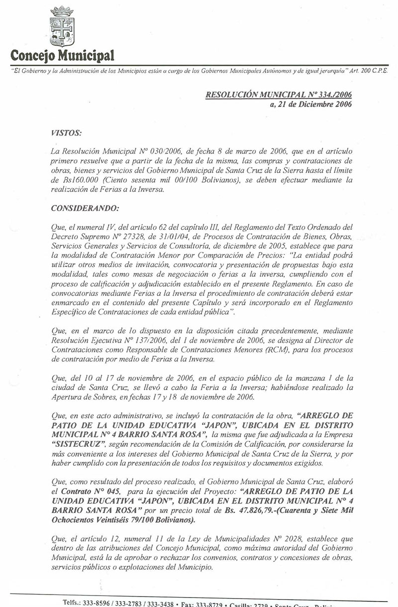 Se aprueba el Contrato No. 045/2006, para la ejecución del Proyecto: Arreglo de Patio de la Unidad Educativa “Japón”, ubicada en el Distrito Municipal No.4, Barrio Santa Rosa, suscrito entre el Gobierno Municipal de Santa Cruz de la Sierra y la Empresa SISTECRUZ.