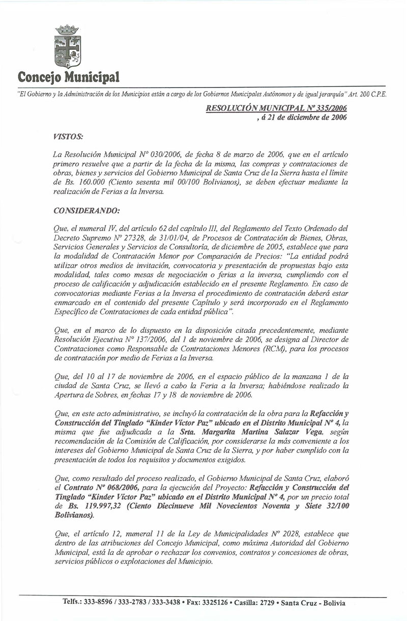 Se aprueba el Contrato No. 068/2006, para la ejecución del Proyecto: Refacción y Construcción del Tinglado “Kinder Víctor Paz”, ubicado en el Distrito Municipal No.4, suscrito entre el Gobierno Municipal de Santa Cruz de la Sierra y la Sra. Margarita Martina Salazar Vega.
