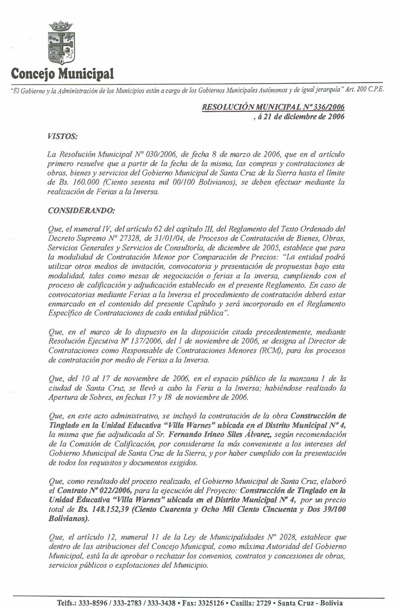 Se aprueba el Contrato No. 022/2006, para la ejecución del Proyecto: Construcción de Tinglado en la Unidad Educativa “Villa Warnes”, ubicada en el Distrito Municipal No. 4, suscrito entre el Gobierno Municipal de Santa Cruz de la Sierra y la Sr. Fernando Irineo Siles Álvarez.