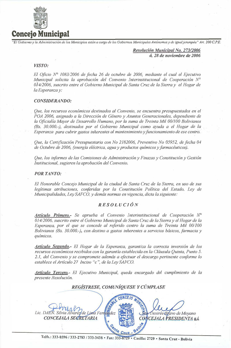 Se aprueba el Convenio Interinstitucional de Cooperación N° 014/2006, suscrito entre el Gobierno Municipal de Santa Cruz de la Sierra y el Hogar de la Esperanza, por el que se concede al referido centro la suma de Treinta Mil 00/100 Bolivianos (Bs. 30.000.-), con destino a gastos inherentes a servicios básicos, farmacia y químicos.