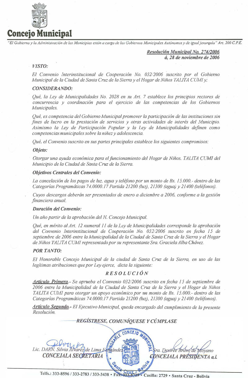 Se aprueba el Convenio 032/2006 suscrito en fecha 15 de septiembre de 2006 entre la Municipalidad de la Ciudad de Santa Cruz de la Sierra y el Hogar de Niños TALITA CUMI para otorgar un apoyo económico por un monto de Bs. 15.000.- dentro de las Categorías Programáticas 74.0000.17 Partida 21200 (luz), 21300 (agua) y 21400 (teléfonos).