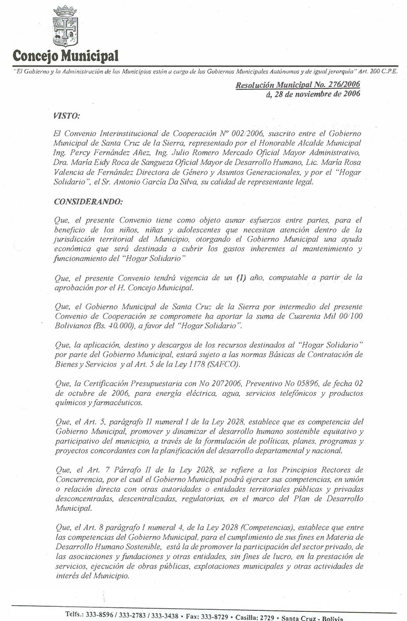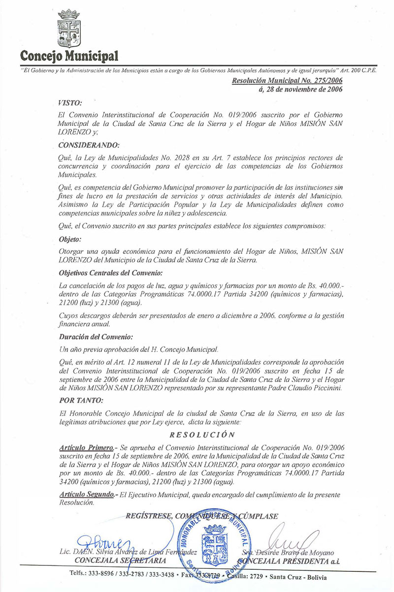 Se aprueba el Convenio Interinstitucional de Cooperación No. 019/2006 suscrito en fecha 15 de septiembre de 2006, entre la Municipalidad de la Ciudad de Santa Cruz de la Sierra y el Hogar de Niños MISIÓN SAN LORENZO, para otorgar un apoyo económico por un monto de Bs. 40.000.- dentro de las Categorías Programáticas 74.0000.17 Partida 34200 (químicos y farmacias), 21200 (luz) y 21300 (agua).