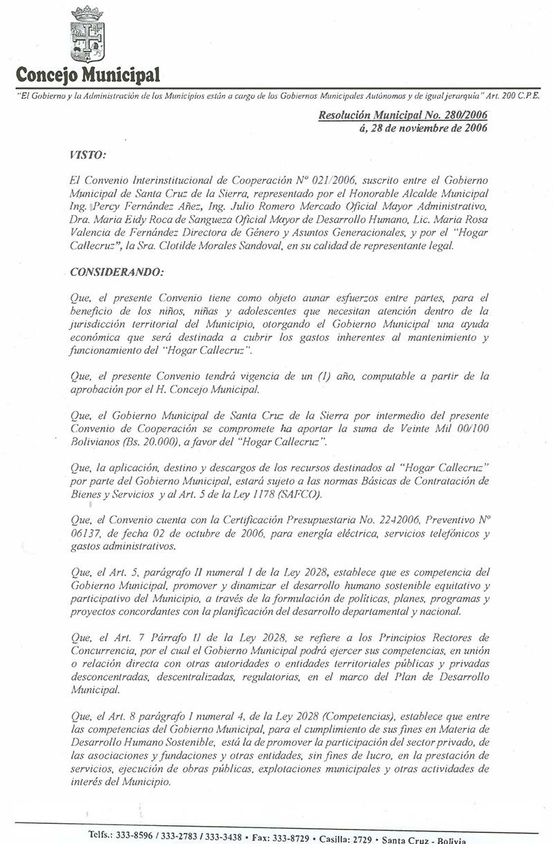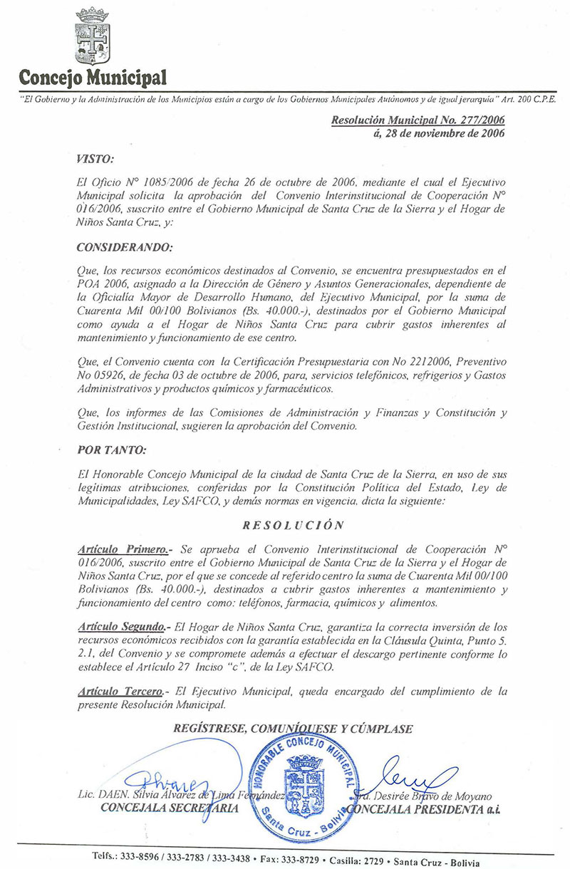 Se aprueba el Convenio Interinstitucional de Cooperación N° 016/2006, suscrito entre el Gobierno Municipal de Santa Cruz de la Sierra y el Hogar de Niños Santa Cruz, por el que se concede al referido centro la suma de Cuarenta Mil 00/100 Bolivianos (Bs. 40.000.-), destinados a cubrir gastos inherentes a mantenimiento y funcionamiento del centro como: teléfonos, farmacia, químicos y alimentos.
